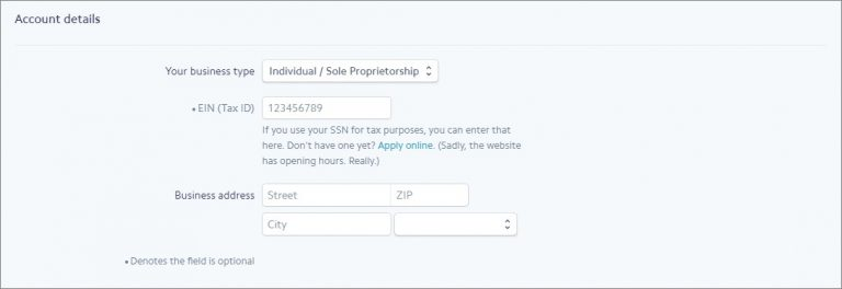 Enter your account details: choose your business type from the dropdown menu, enter your Tax ID (optional) and business address.