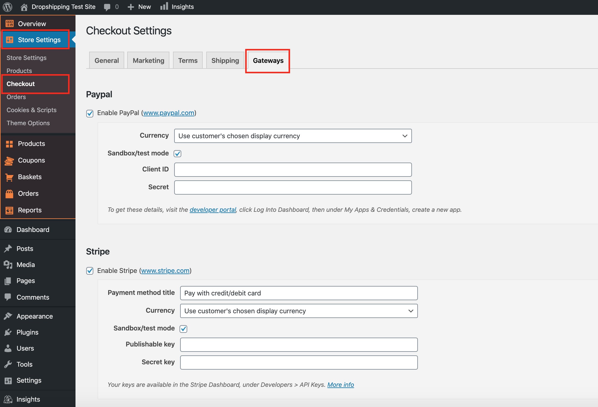 2. From the store dashboard go to: > Store Settings > Checkout > Gateways