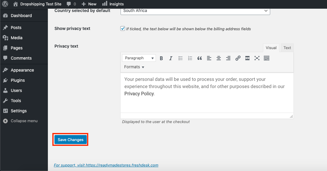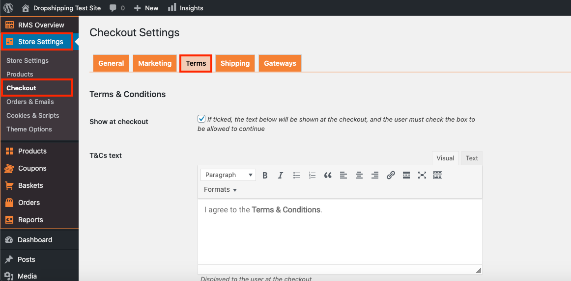 IV. From there, go to: > Store Settings > Checkout > Terms